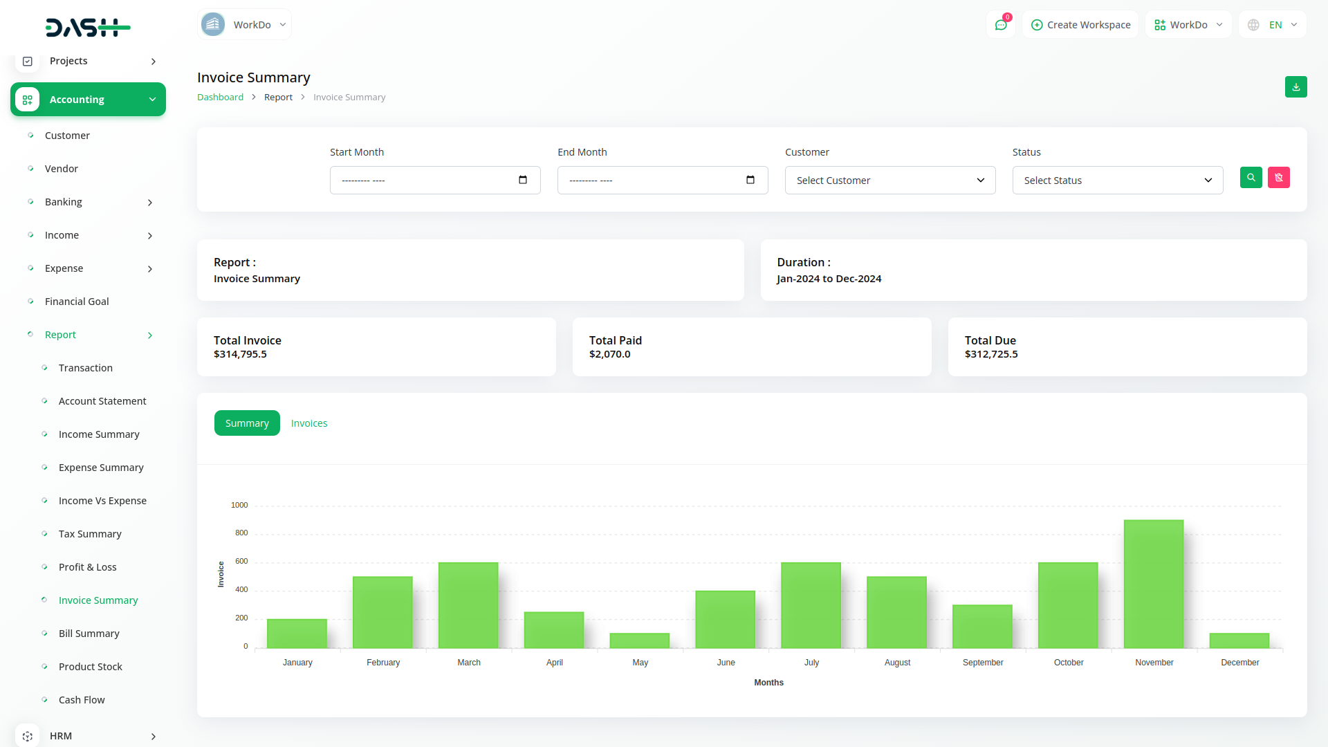 Get a report on transactions with an easy filtering option. Download the required account statements in either PDF, CSV, or Excel format. You get duly prepared reports on individual Income, Expenses, Tax, Invoice, and bill summary. Filter them based on Account, category, and customers. Also, a graphical display of the Income VS Expense chart along with a detailed calculation of Profit and Loss will help you make informed decisions. Filter the tax summary and Income VS Expense chart based on financial years.